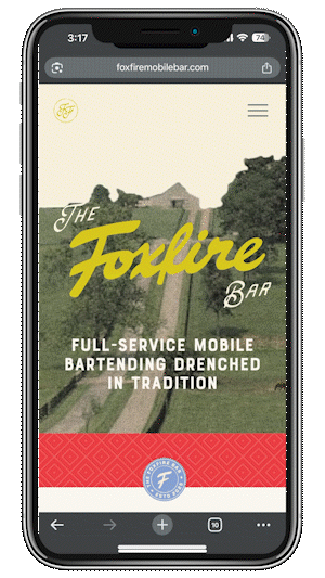 Mobile phone displaying a website for The Foxfire Mobile Bar with text about mobile bartending service.