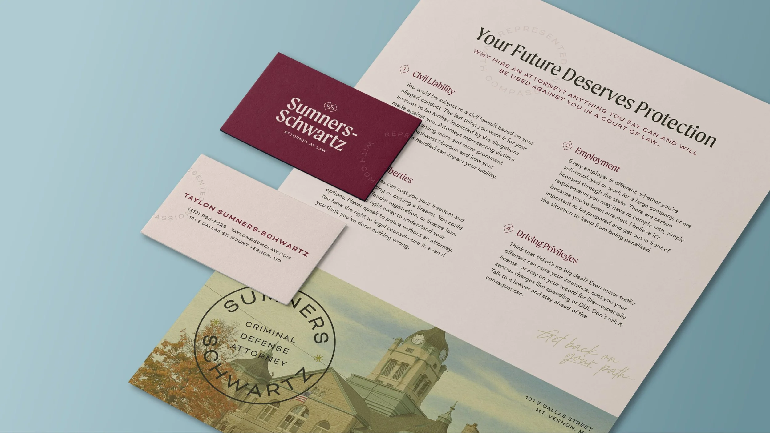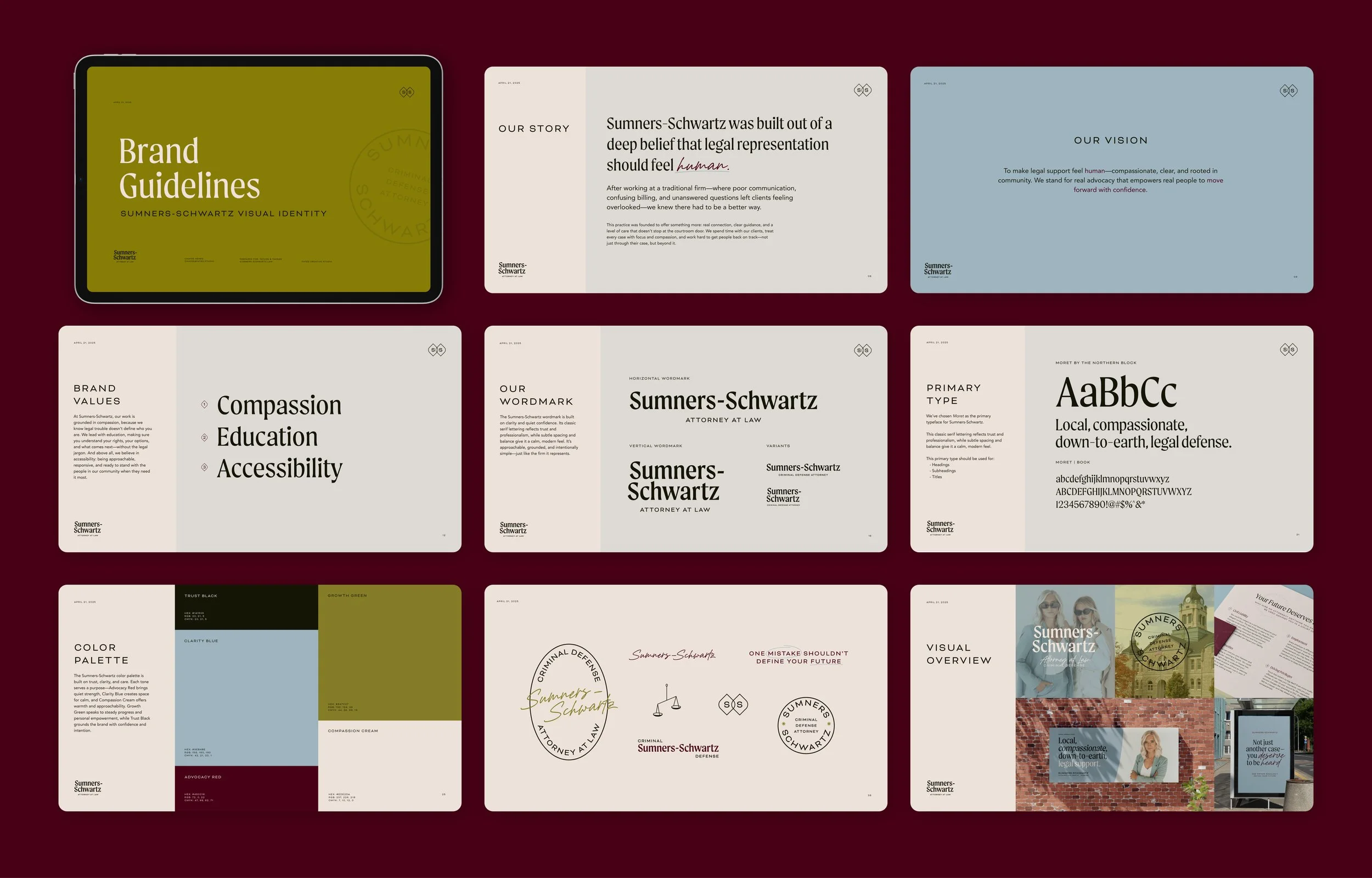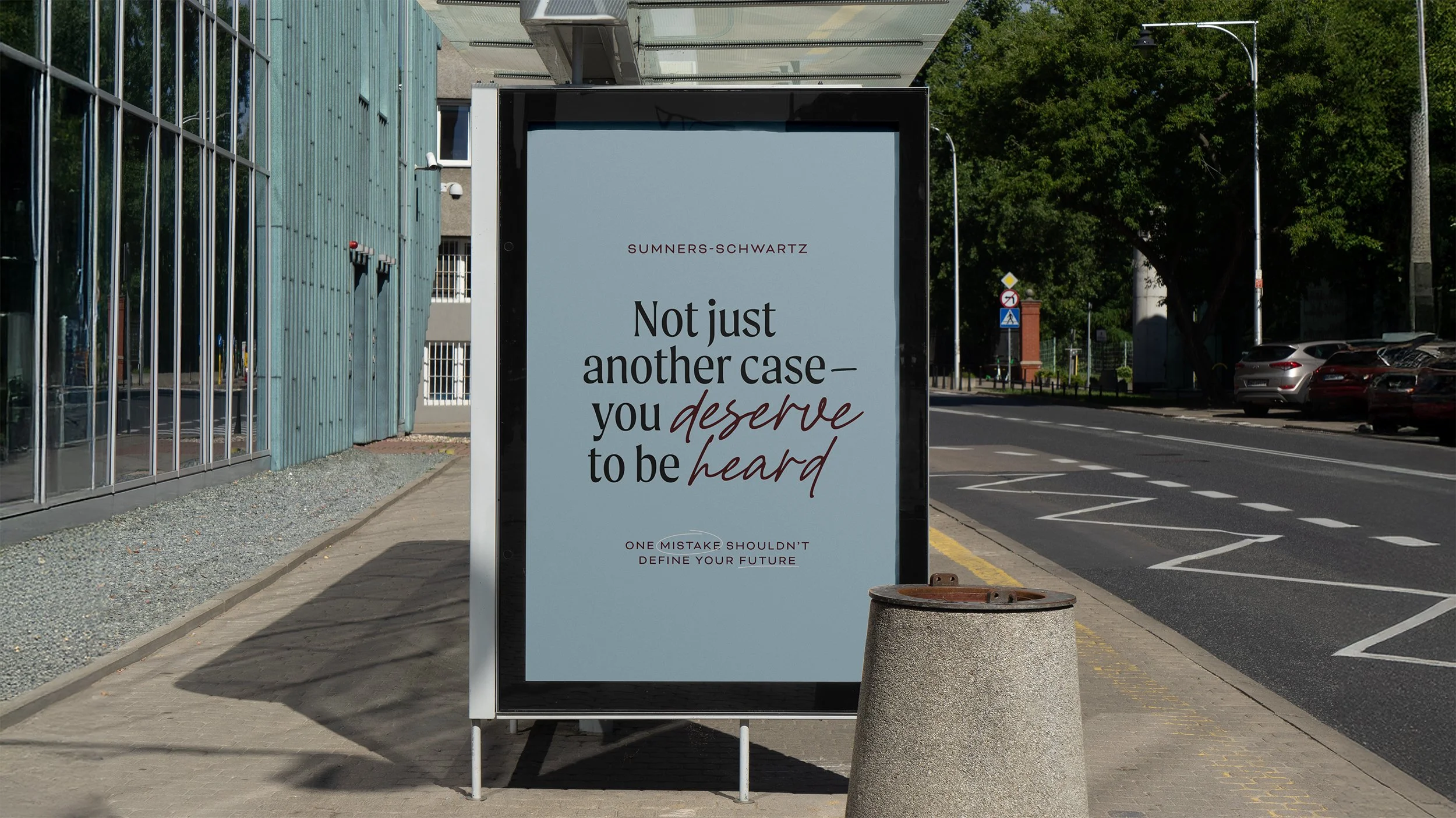 The legal industry carries a long-established visual language of one built around dark palettes, heavy typography, and rigid, masculine aesthetics meant to signal authority. While these conventions exist for a reason, we approached the brand for Sumners-Schwartz with a more thoughtful lens.